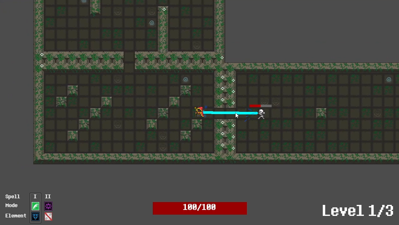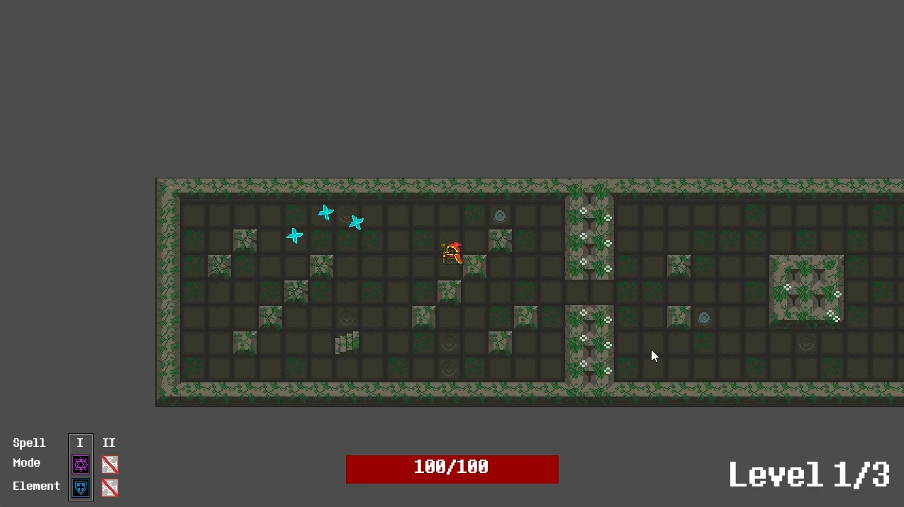 This last game was what I developed for the 4-credit hour assignment. I called it Wizard Dungeon. This game is more akin to something I’d play in my free time. In years past, I have experimented with some level generation techniques for a couple different 2D-style games, so I was glad to implement that here. I also thought long and hard about the spell system. I enjoy games that let the player come up with their own strategy for how the game is best played, so I wanted to offer combinations for spells the player uses.