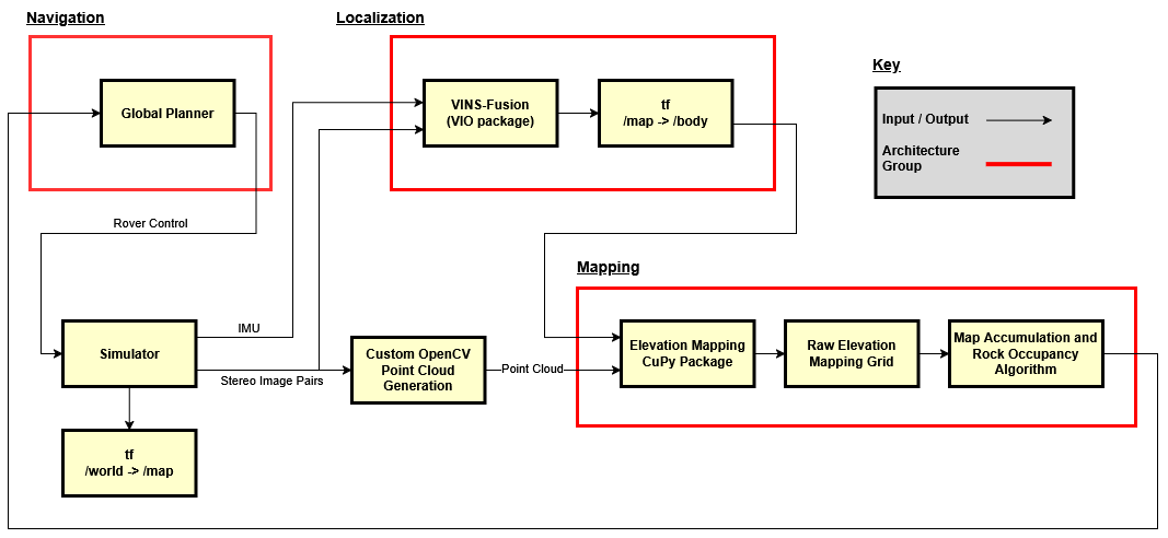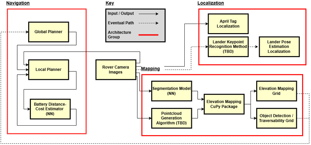 The figure below shows the initial approach. We would use the software package called “Elevation Mapping CuPy” in order to map the terrain. It requires a point cloud of the surrounding area as well as ROS-style coordinate frames for localization. We also wanted to use a segmentation model with the mapping data in order to properly identify obstacles. This data would be used in the navigation stack, consisting of a global planner optimizing for unexplored areas of the terrain and a local planner for obstacle avoidance. You’ll note we wanted to use another neural network that estimated our battery usage given a planned path. This ended up not being important for the qualifier round as no battery recharging was necessary for the limited mission. For localization, we relied on April tags attached to the central lunar lander, however we wanted to develop a different method down the line using keypoints in order to gain bonus points.
