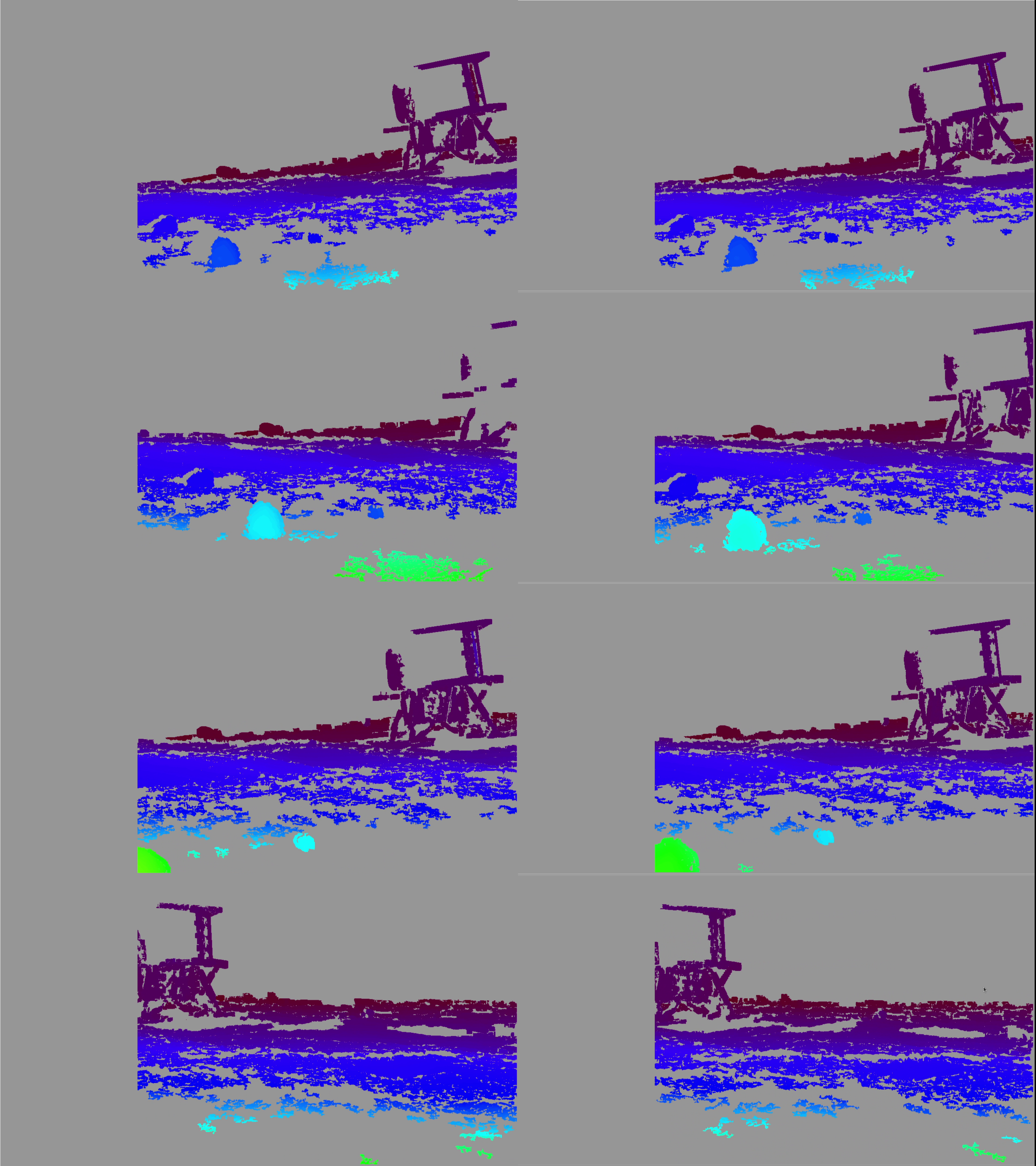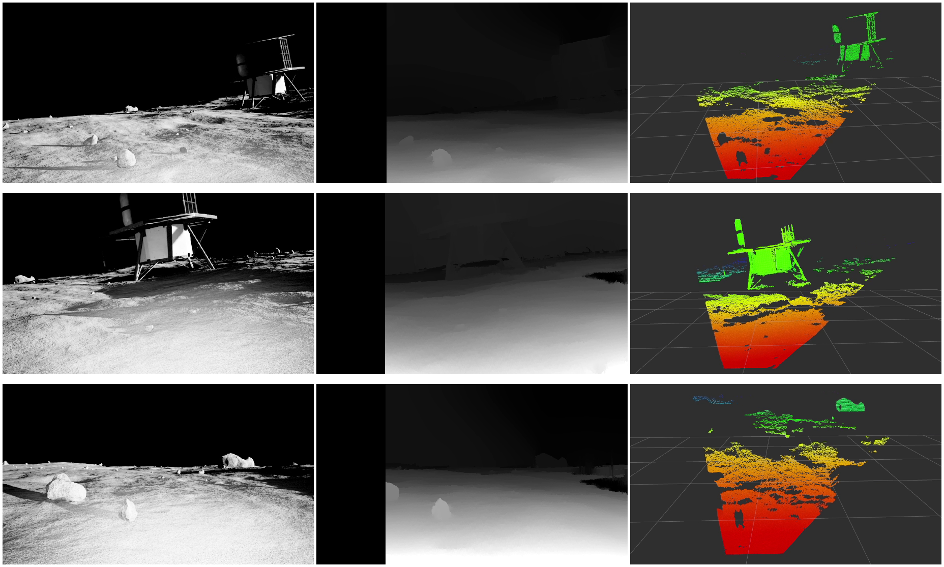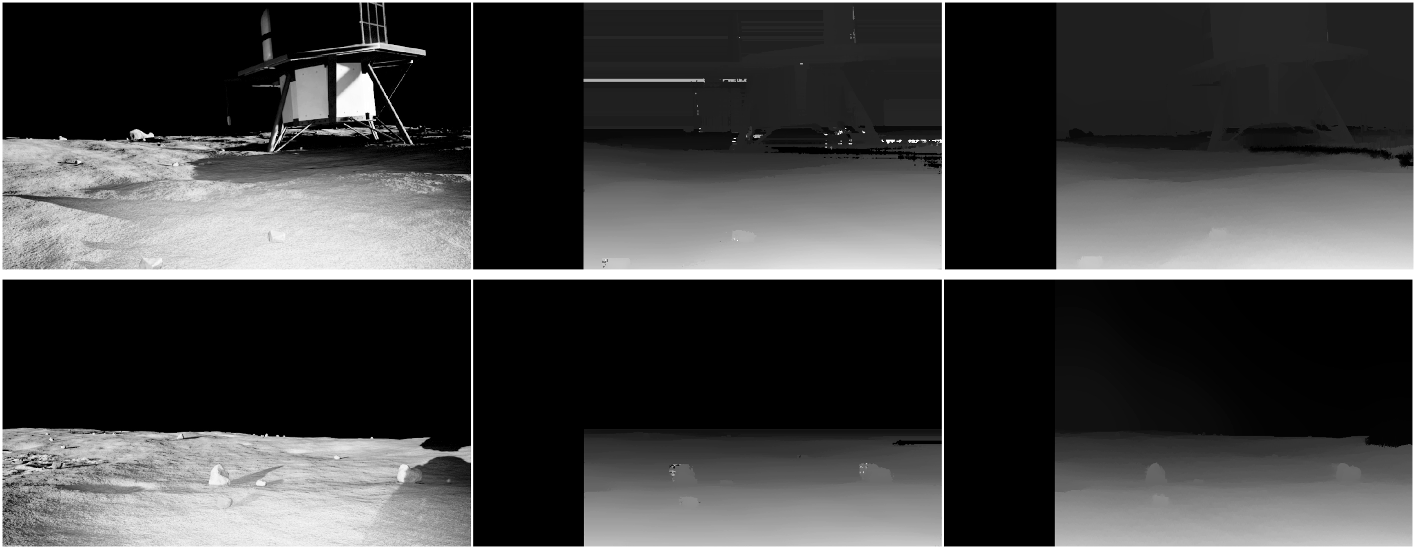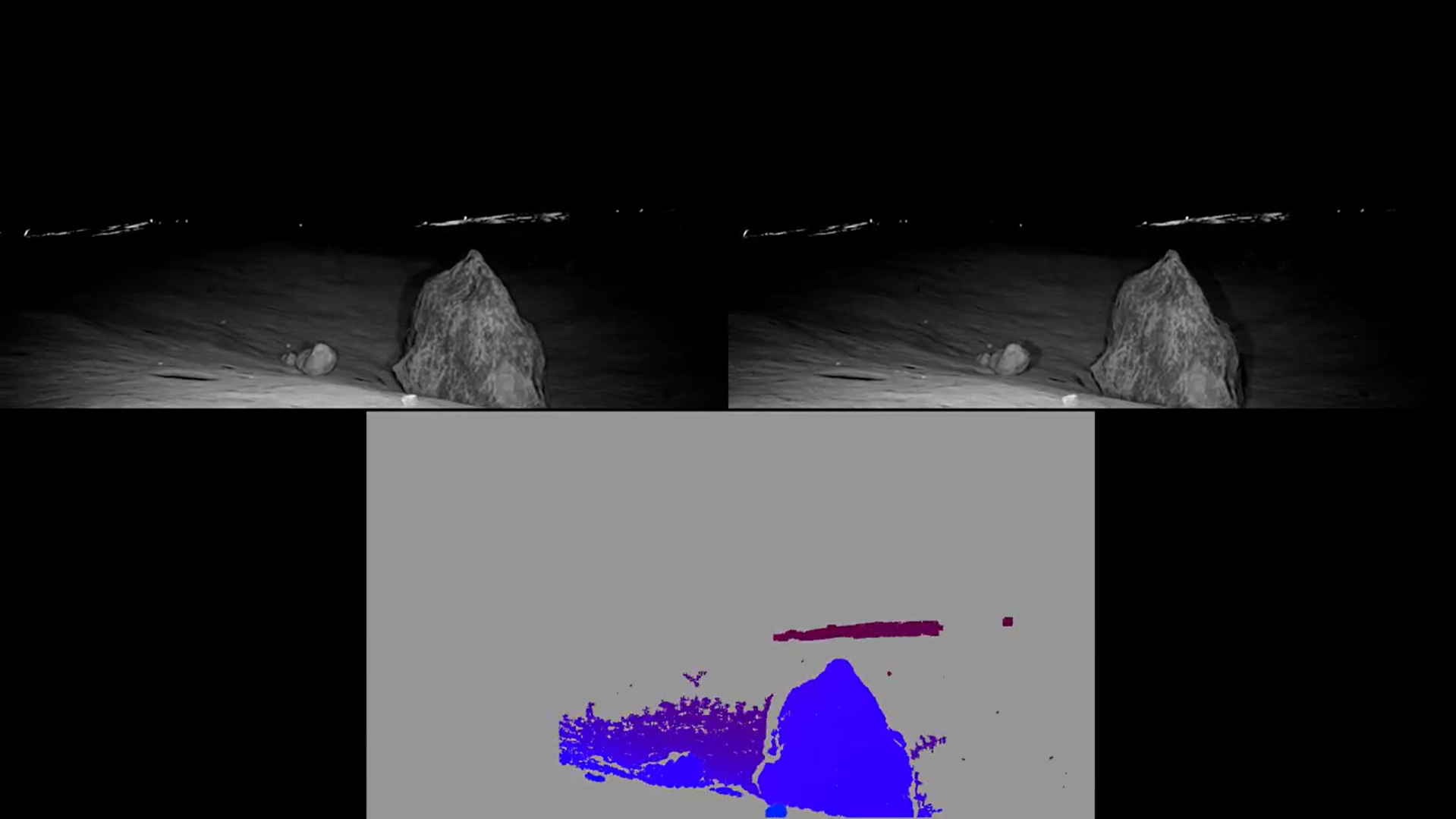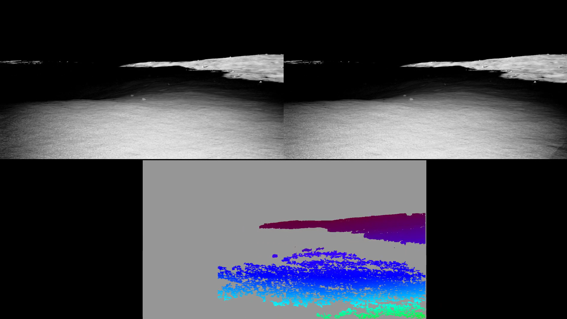 This process did not improve the point clouds very much. Part of the issue here touches on problems with the lunar environment itself. Low light levels, long shadows, and terrain that is hard to differentiate all culminate in errors in or lack of stereo matching (part of the process of turning a stereo pair into a 3D point cloud). Now this output is not actually too terrible. It is fairly dense with some voids here and there. However, note that the lunar lander, a part of the theoretical mission of this competition, is in view. This creates many distinct points that drastically helps stereo matching. When it is not in view, the disparity maps end up looking like the following: