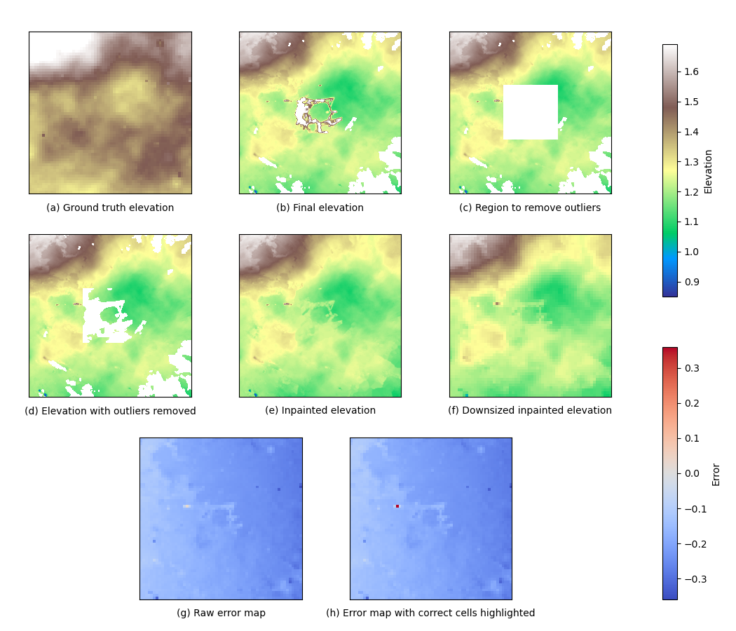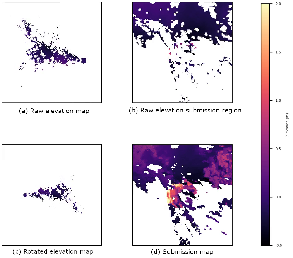 I found that this solution performed poorly. Also, due to the elevation errors I found, I was not able to produce a working rock occupancy grid (which was required for the competition). In turn, rock obstacles could not be detected, and a final autonomous solution was not achievable. According to competition guidelines, this data would have only had a single scoring grid cell (of 3,600 total).