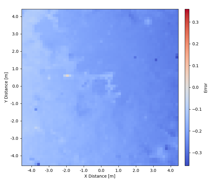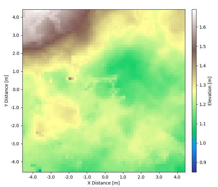 With the updated architecture, I drove the rover in simulation to collect elevation data. Below is example data from a single trial, but I did perform many such experiments. I found all produced similar data with this solution.